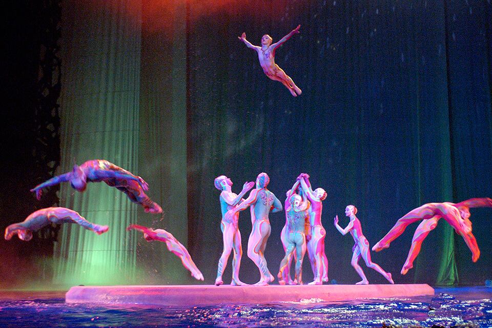 Ce numéro marie d'exigeantes routines gymnastiques à un ballet aérien époustouflant. Le décor et la scène semblent bouger tout autant que les quatre acrobates. Ici, l'eau sert à la fois de toile de fond et de partenaire de danse. Ciel et mer donnent un nouveau souffle à ce traditionnel numéro de cirque.
