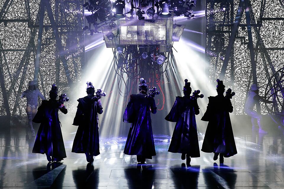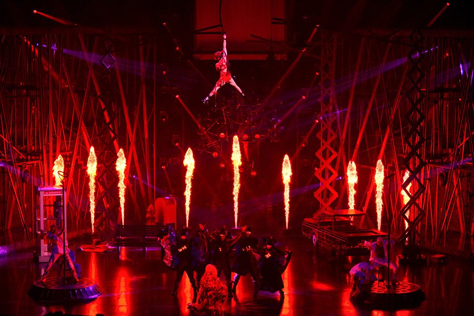 - On stage, four large towers used as projection surfaces, move from side to side and go up and down, even turning into platforms for the dancers and acrobats.